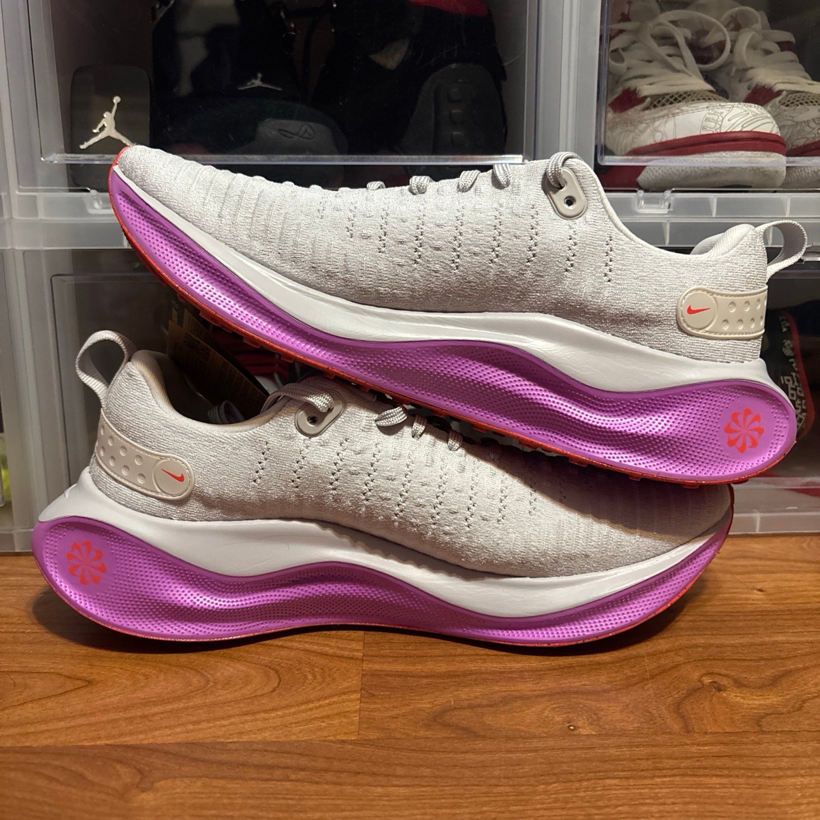 The Nike ReactX Infinity Run 4 Vast Grey Hyper Violet Running Shoes in Men's size 11.5 offer a comfortable and stylish option for running and jogging activities. Featuring a low top design with a lace-up closure, these athletic sneakers provide a solid grey color with a pop of violet accents. Made with breathable fabric lining and a cushioned foam insole, these shoes are perfect for both activewear and casual occasions during the summer, fall, and spring seasons. The rubber outsole ensures traction and durability, making them a reliable choice for active individuals.